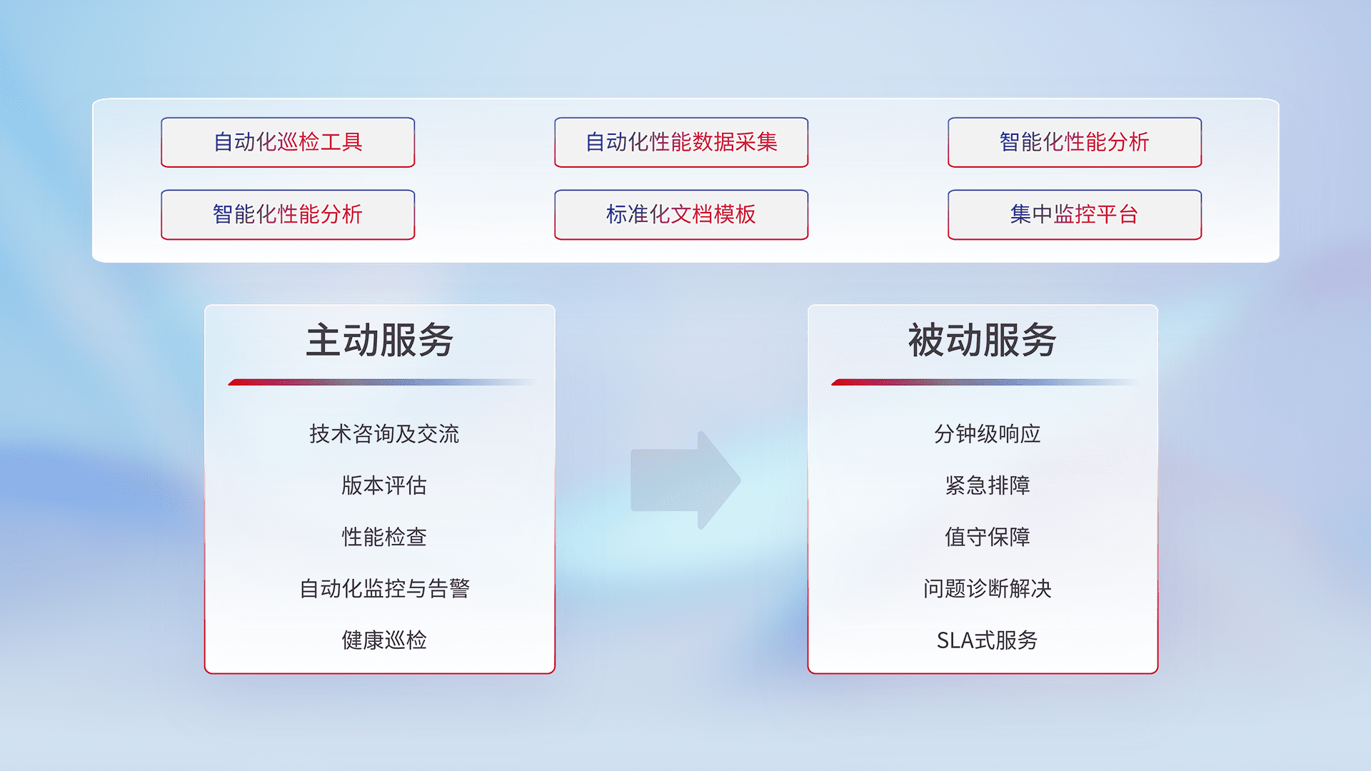智能化工具和标准化文档,,,,保障服务质量,,,,提供主动服务(包含技术咨询、、版本评估、、性能检查、、、自动化监控与告警、、、、健康巡检)和被动服务包含(分钟级响应、、紧急排障、、值守保障、、、问题诊断解决、、、SLA服务)。。。。