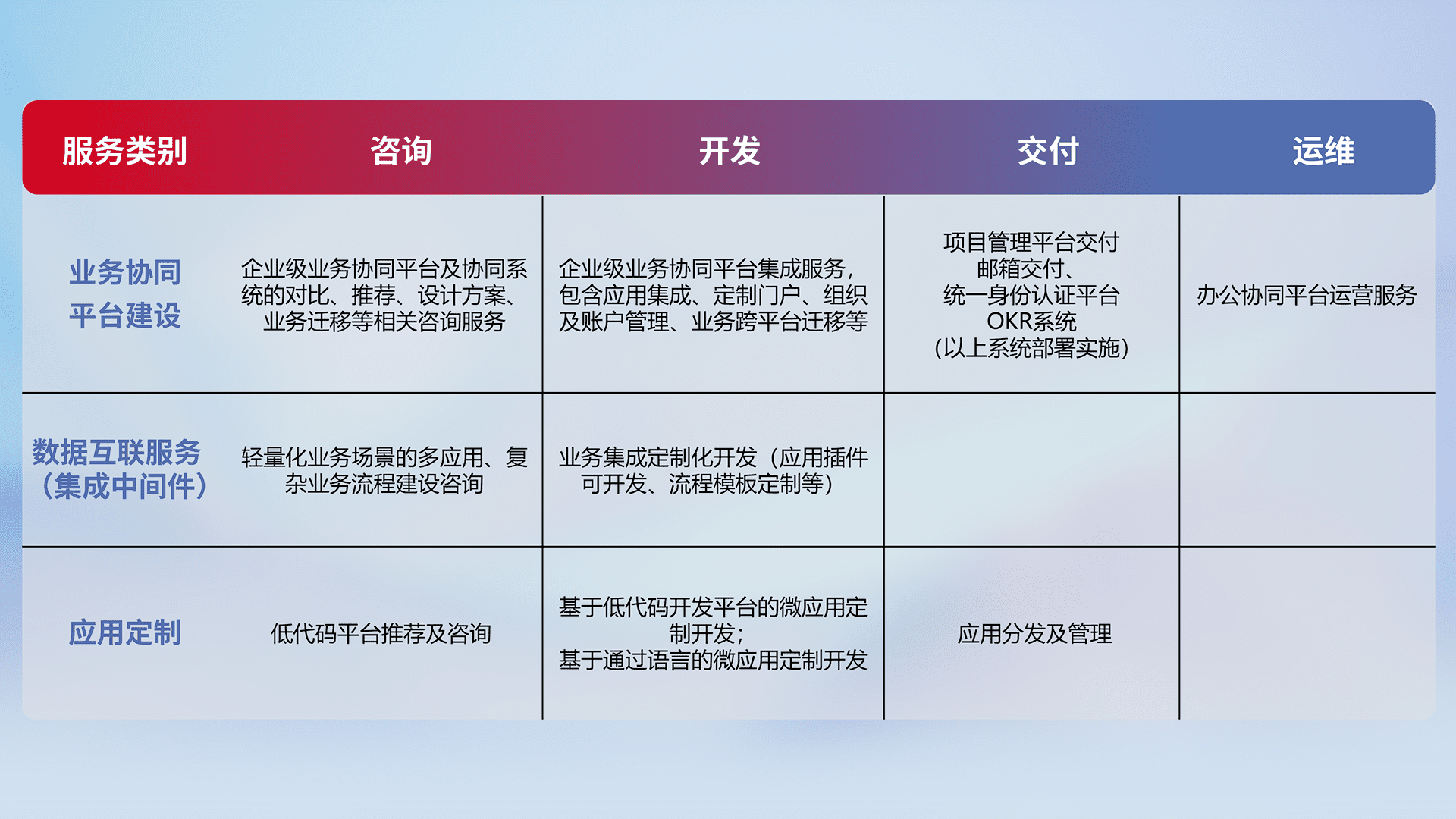 针对钉钉、、、、企微、、IDaas等平台级产品提供产品的规划、、、方案、、、交付、、、、定制化开发等服务,,,实现如统一协同办公、、、智能客户服务、、、混合会议管理、、、、智能数据查询、、、、等业务场景,,,实现数字化转型。。